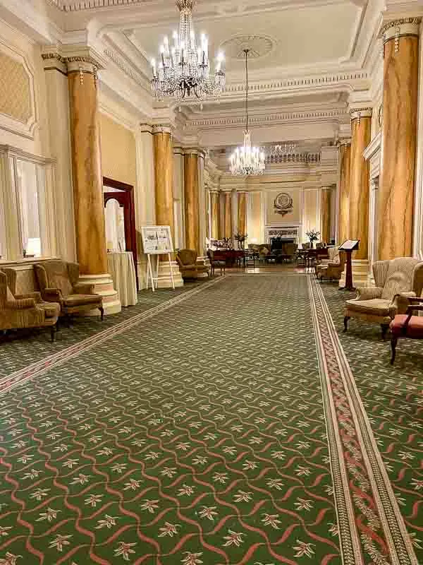 The pillared lobby stretched ahead with sparkling chandeliers overhead. At the far end the Great Hall with its lofty ceiling and balconies opened out before us.